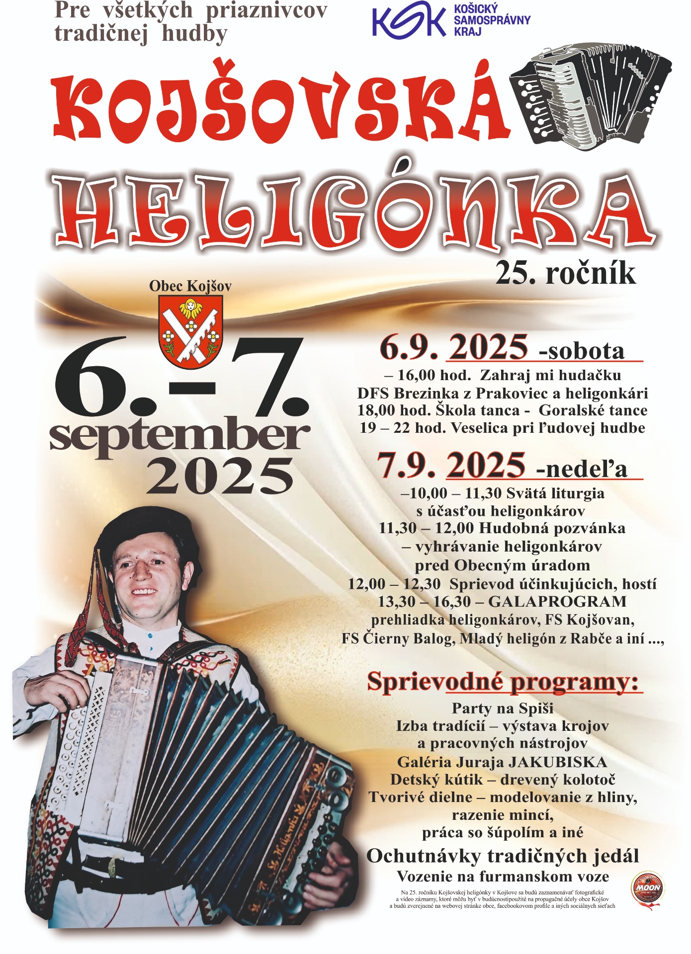 Obec Kojšov Vás srdečne pozýva na 25. ročník Kojšovskej heligónky, ktorý sa bude konať v dňoch 6. a 7.9.2025 v obci Kojšov.