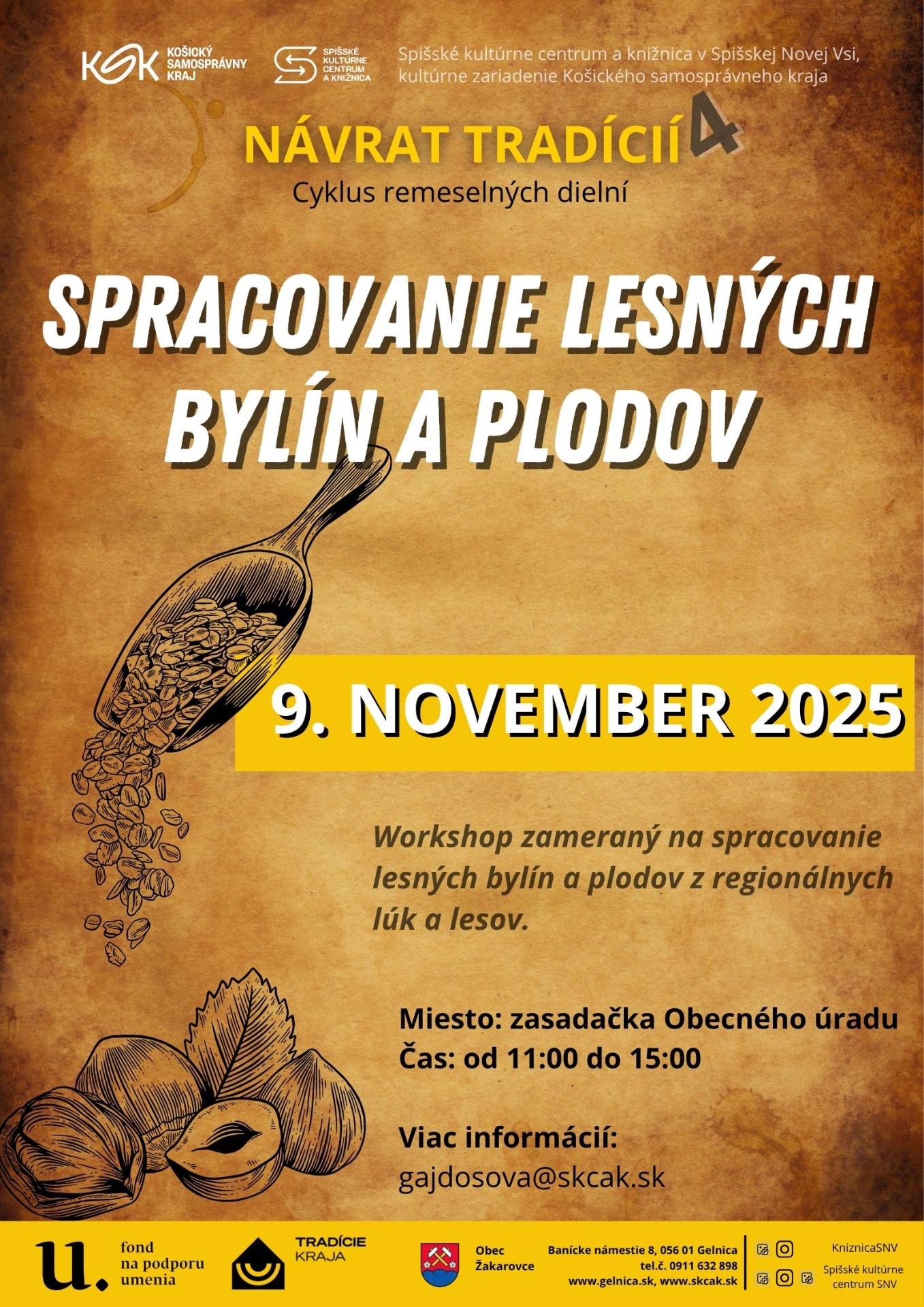 Obec Žakarovce Vás pozýva 9. novembra 2025 na workshop zameraný na spracovanie lesných bylín a plodov z regionálnych lúk a lesov. Miesto konania: Zasadacia miestnosť Obecného úradu. Čas: od 11:00 h. do 15:00h.